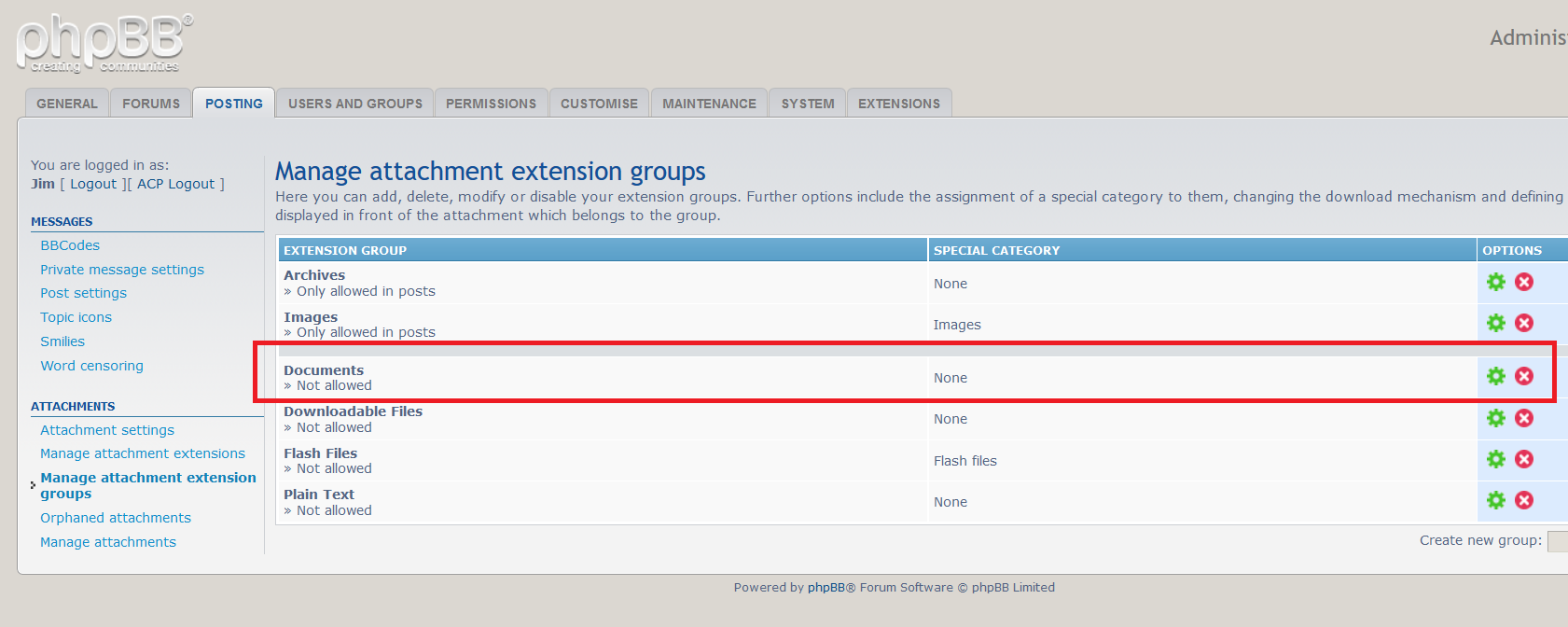 In phpBB gaan de toestemmingen qua uploaden van extensies per groep. De extensies pdf, doc en docx (Word-documenten) worden samen met nog een paar anderen verzameld onder de groep "Documenten". Je zal dus om deze al bijlage te kunnen uploaden die hele groep moeten goedkeuren voor plaatsen. Standaard staat deze groep namelijk op niet toegestaan. Zie de afbeelding hieronder waar je dat kan veranderen.